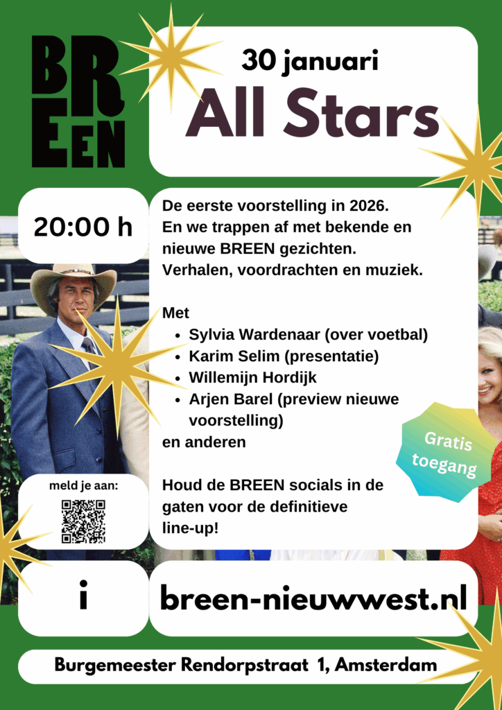 De eerste voorstelling (voor volwassenen) in 2026. En we trappen af met bekende en nieuwe BREEN-gezichten. Verhalen, voordrachten en muziek.