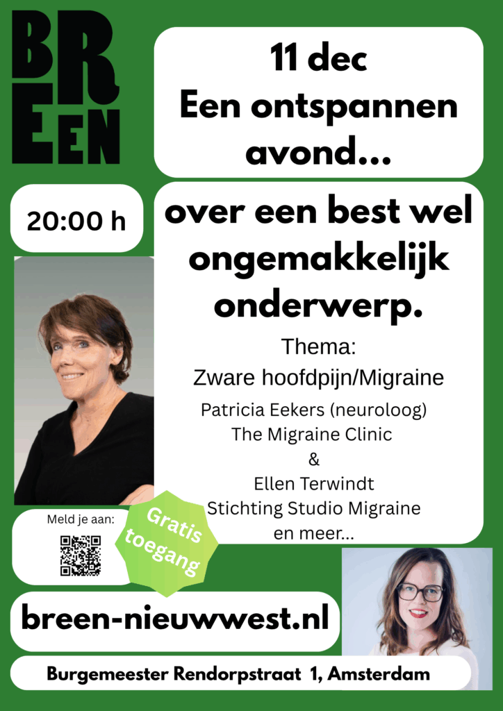 Op 11 december gaan we in BREEN in gesprek met vrouwen met een niet-westerse migratie-achtergrond. Hoe ervaren zij migraine? Is er extra taboe? En hoe worden ze ontvangen door hun huisarts? Patricia Eekers en Ellen Terwindt geven die avond ook uitleg en advies.