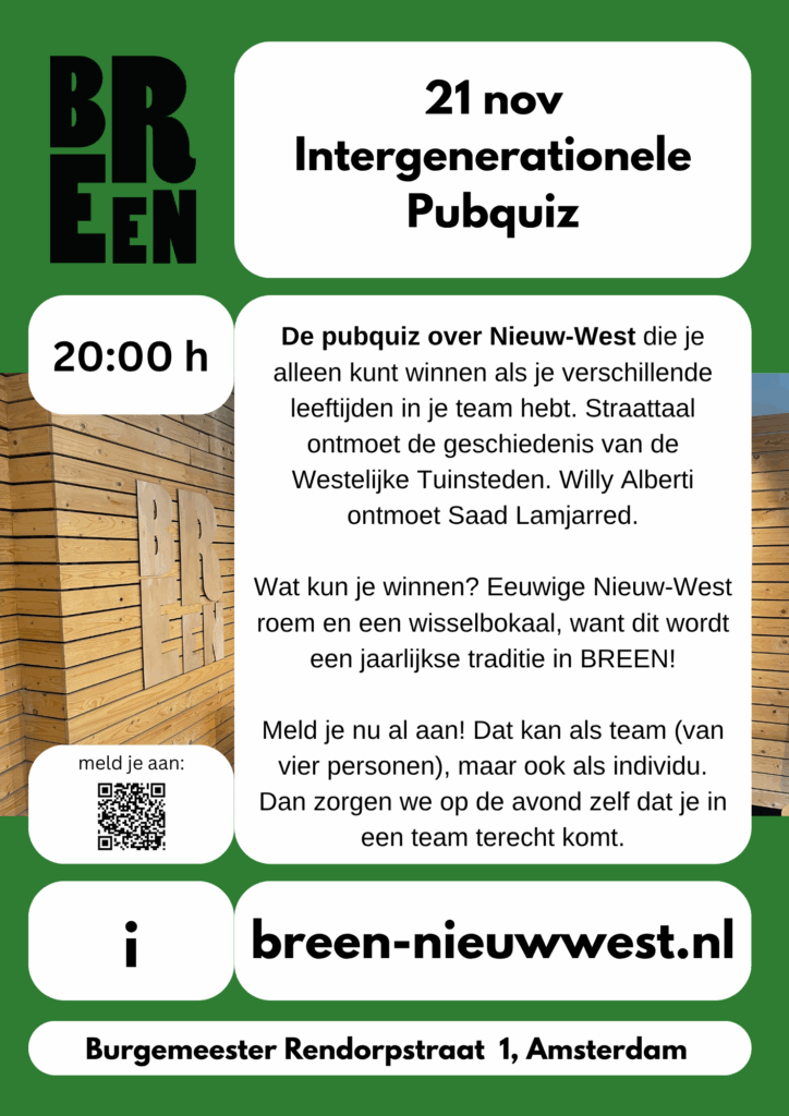 De pubquiz over Nieuw-West die je alleen kunt winnen als je verschillende leeftijden in je team hebt. Straattaal ontmoet de geschiedenis van de Westelijke Tuinsteden. Willy Alberti ontmoet Saad Lamjarred.