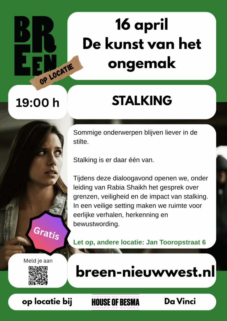 Tijdens deze dialoogavond openen we, onder leiding van Rabia Shaikh, het gesprek over grenzen, veiligheid en de impact van stalking. In een veilige setting maken we ruimte voor eerlijke verhalen, herkenning en bewustwording.