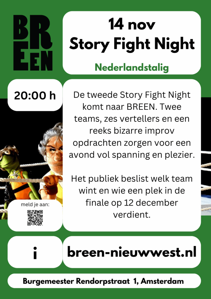 Op 14 november betreden twee teams de arena in BREEN in Amsterdam Nieuw-West voor de tweede halve finales*. Zij strijden om de winst, hun tanden stukbijtend op het achterstevoren vertellen van een sprookje, het ter plekke verzinnen van een relaas en het fabriceren van een logisch verhaal op basis van wat de toeschouwers aanreiken.